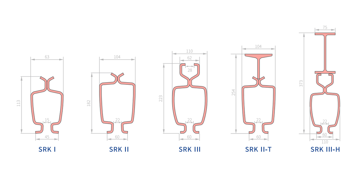 | SRK II-T | Aço macio de alta resistência | 26,6kg/m | 33,88 cm² | 2380cm⁴ | Não equipado com trilhos fixos | O gráfico a seguir | Tamanho personalizado | RAL2002 |